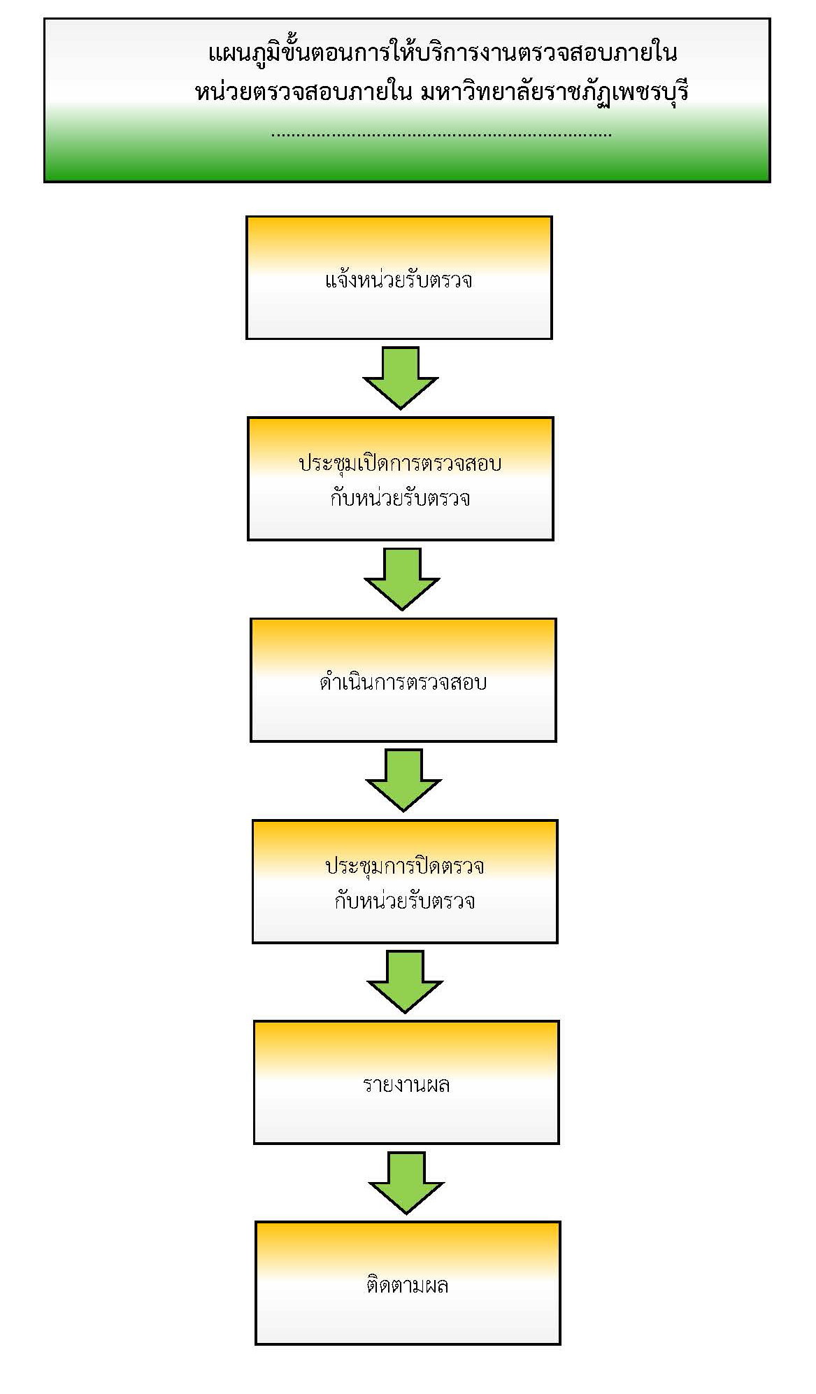 - เมื่อหน่วยรับตรวจส่งกลับรายงานชี้แจงให้หน่วยตรวจสอบภายใน หน่วยตรวจสอบภายในจะทำการสรุปผลตรวจพร้อมจัดทำรายงานผลการตรวจสอบเสนออธิการบดีมหาวิทยาลัยราชภักเพชรบุรีเพื่อพิจารณาสั่งการตามข้อเสเสนอแนะในรายงานผลการปฏิบัติงาน